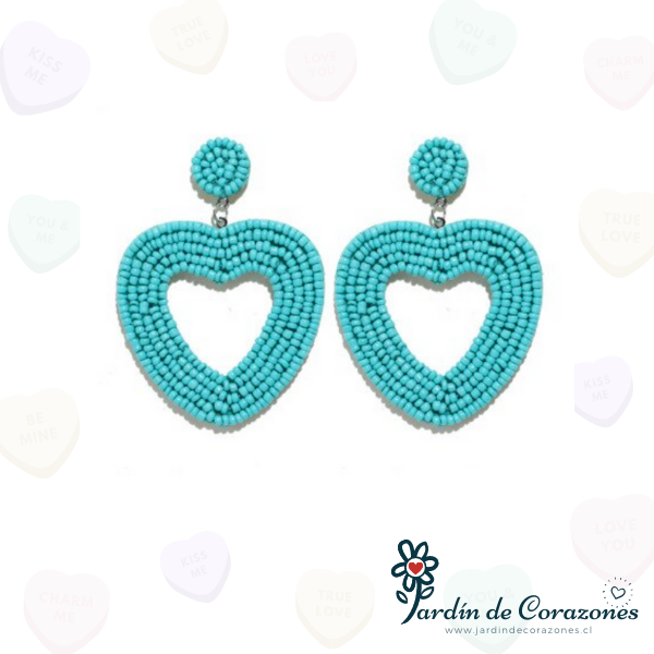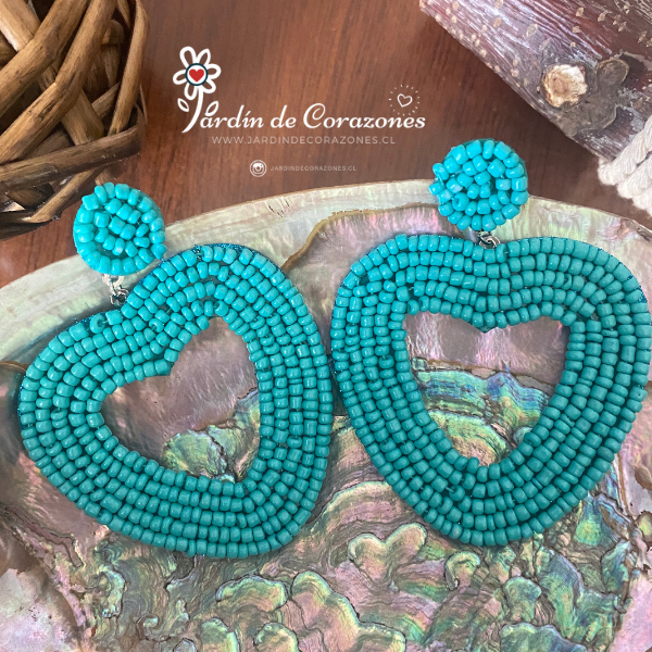 Hermosos aros de corazón con mostacillas turquesa.