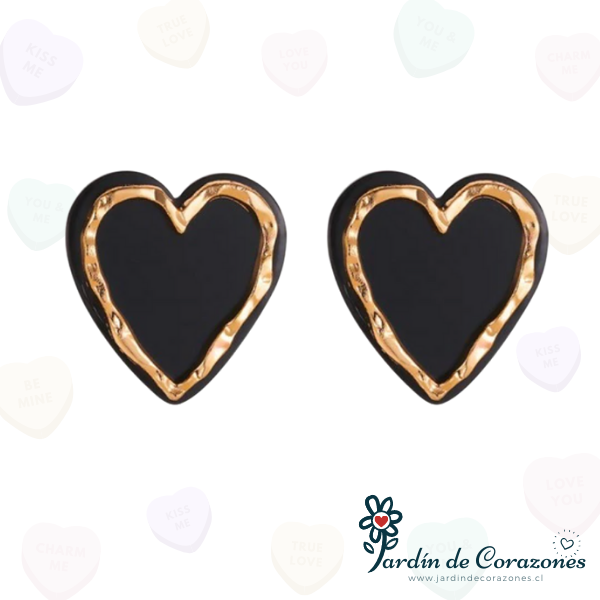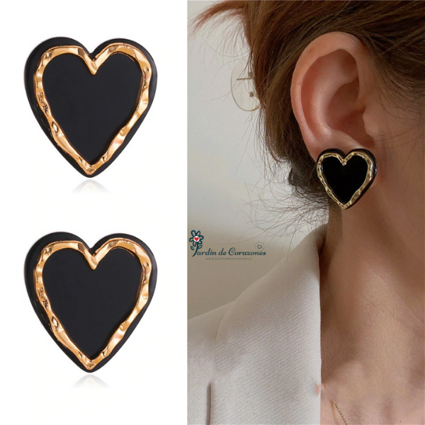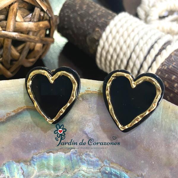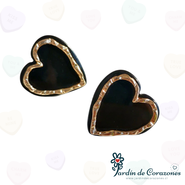 Hermosos aros de corazón color negro con un borde dorado.