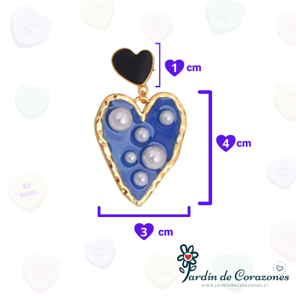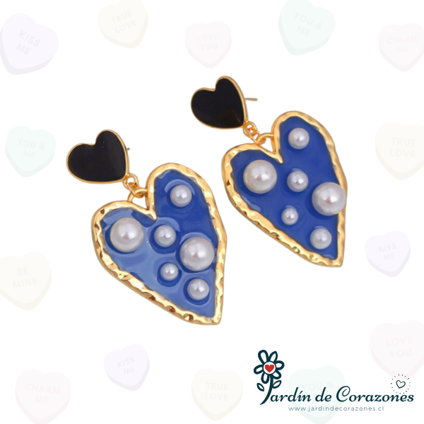 Par de aros que poseen como diseño principal corazones de color Azul incrustado con perlas.