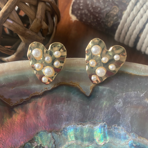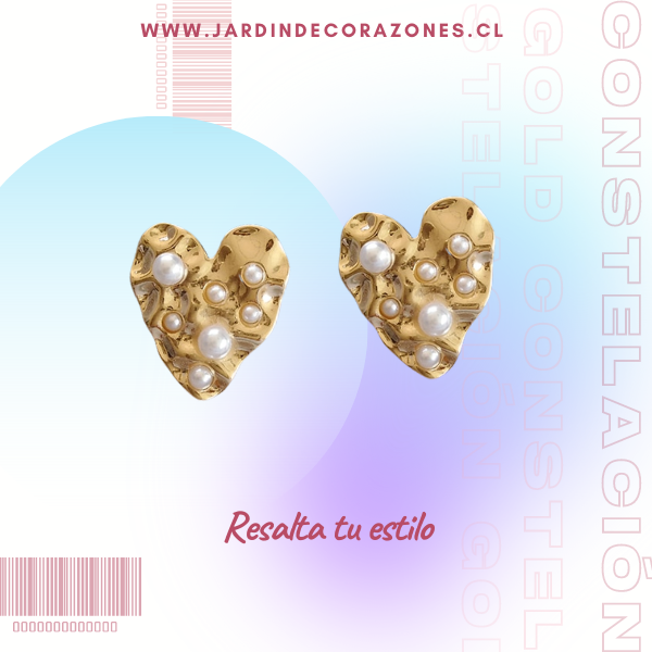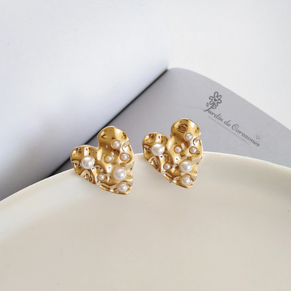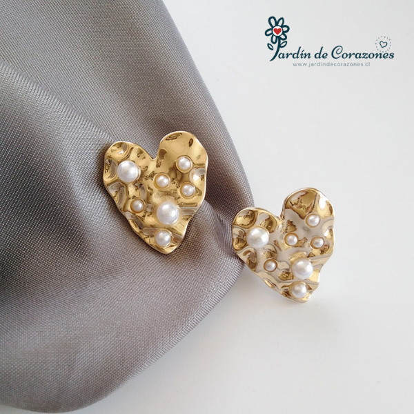 Par de aros que poseen como diseño principal corazones de color gold incrustado con perlas blancas.