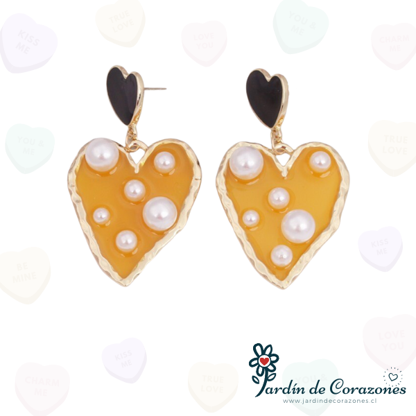 Par de aros que poseen como diseño principal corazones de color naranja, incrustado con perlas.