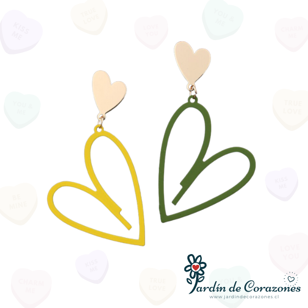 Hermosos aros asimétricos compuestos por corazón verde y amarillo.