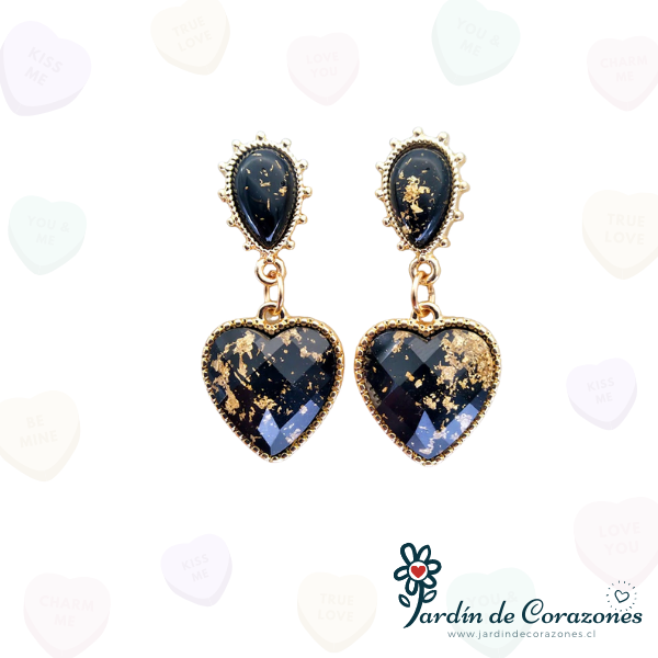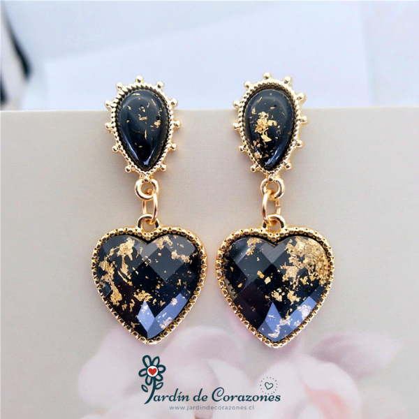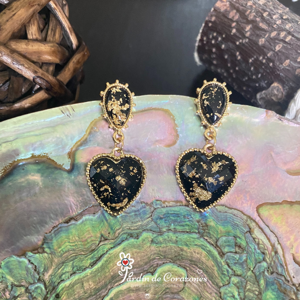 Hermosos aros de corazón color negro y con delicados toques dorados.