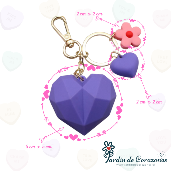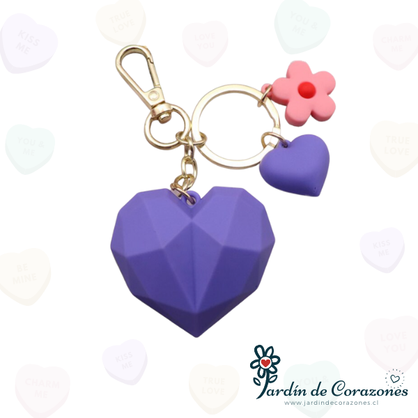 Hermoso llavero, con un corazón lila grande, uno pequeño y una flor.