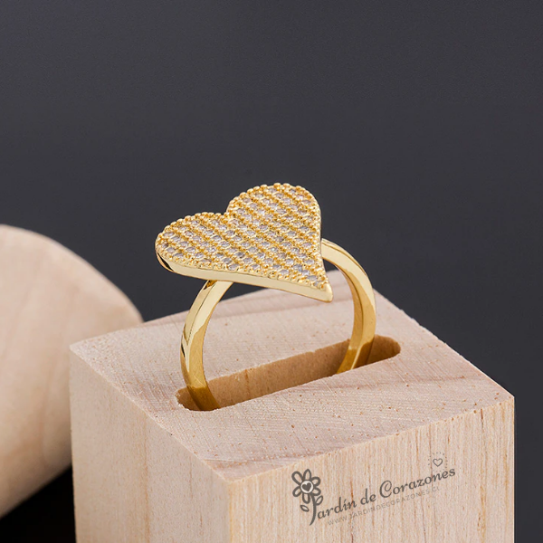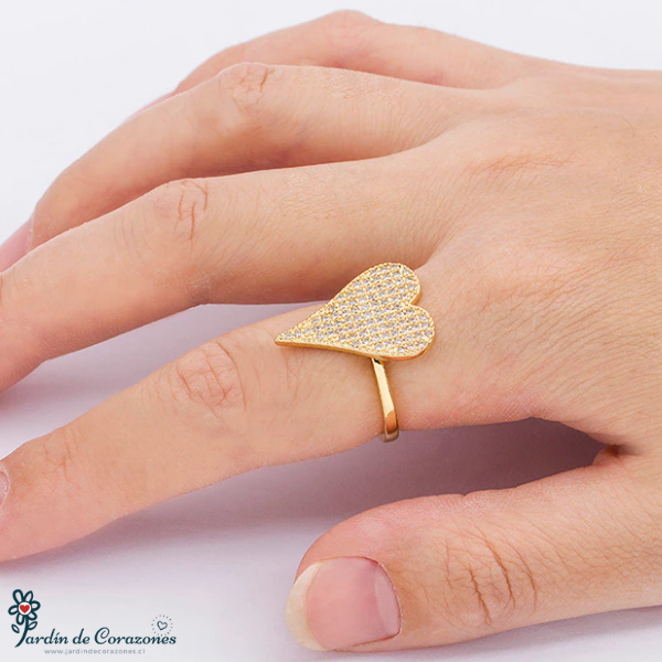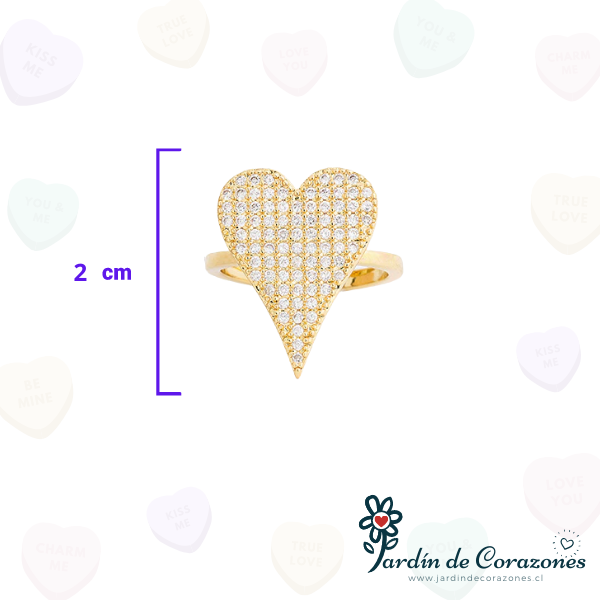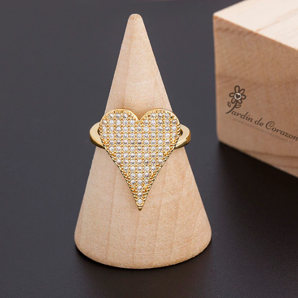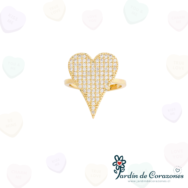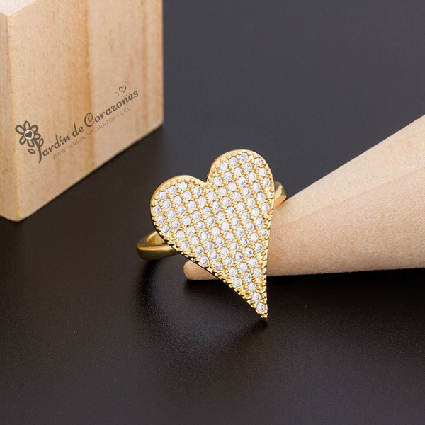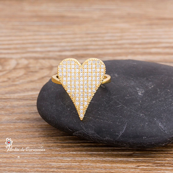 Hermoso anillo ajustable con forma de Corazón relleno de delicados strass blancos.